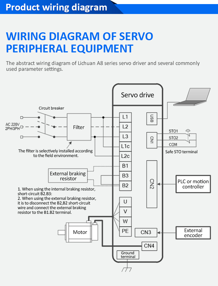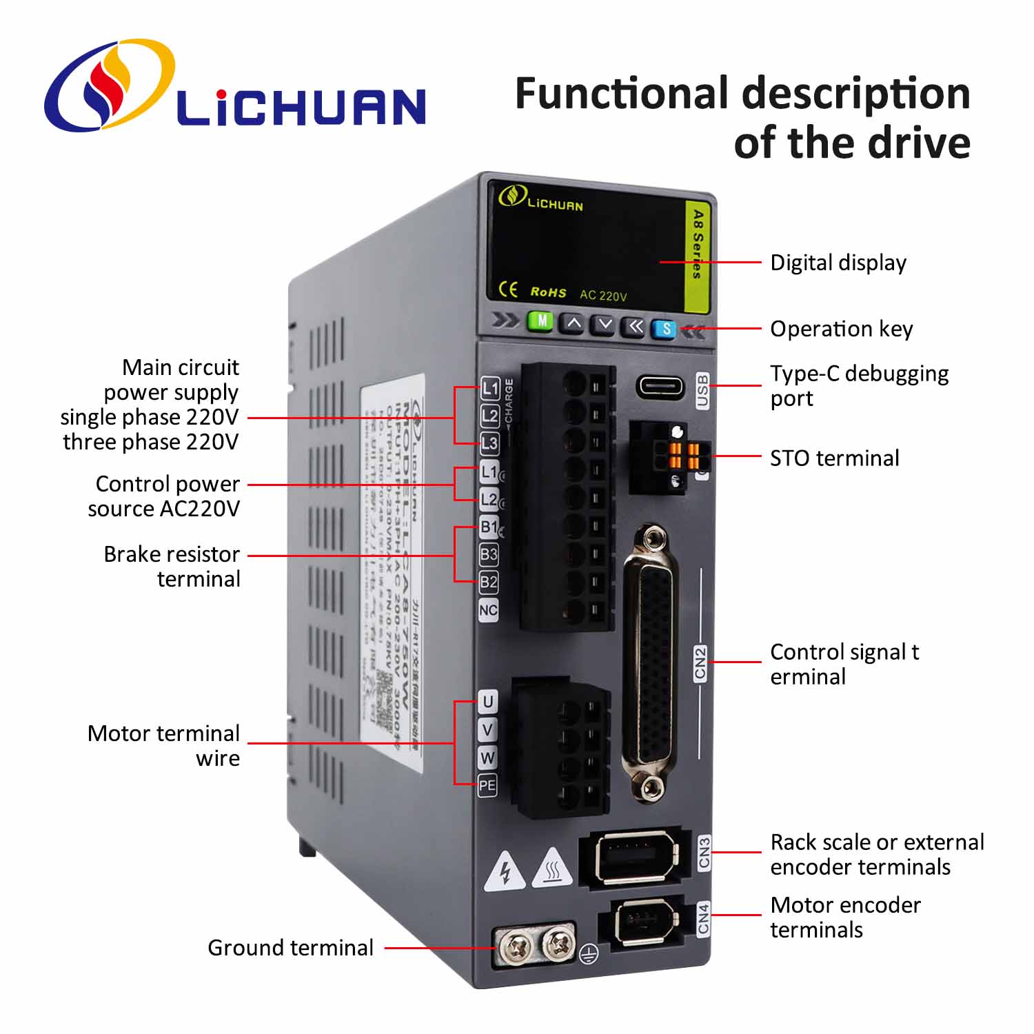 Această serie este un servomotor AC de înaltă performanță, cu funcție integrată de oprire a cuplului de siguranță STO (Safe Torque Off), care respectă standardul de siguranță IEC 61800-5-2 și poate realiza o oprire sigură în caz de urgență. Sistemul acceptă un mod de control complet în buclă închisă și atinge o precizie de poziționare de ± un impuls prin feedback-ul de înaltă rezoluție al codificatorului, care este compatibil cu motoarele rotative și scenariile de aplicare a motoarelor liniare. Este echipat cu interfață de depanare de tip C, acceptă configurarea parametrilor în timp real și are o interfață de comunicație RS485 încorporată (protocol Modbus RTU), iar rata de transmisie poate fi ajustată de la 9,6 kbps ~ 115,2 kbps. Adoptă algoritmul de control al orientării câmpului magnetic (FOC), care este potrivit pentru ocazii de răspuns dinamic ridicat, cum ar fi echipamente CNC de precizie și semiconductor.